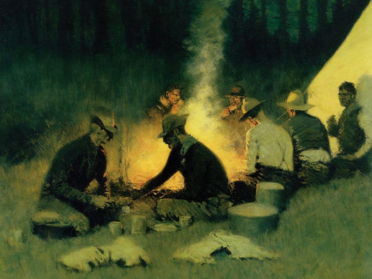 Hunters Camp in the Big Horn White Modern Wood Framed Art Print with Double Matting by Remington, Frederic