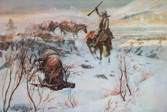 The Buffalo Hunt No. 39 White Modern Wood Framed Art Print with Double Matting by Russell, Charles Marion