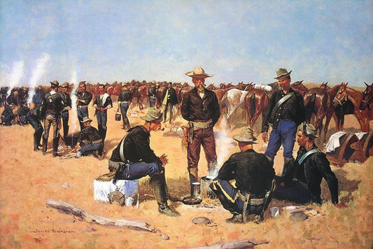 A Cavalrymans Breakfast on the Plains White Modern Wood Framed Art Print with Double Matting by Remington, Frederic