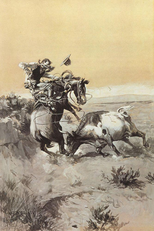 A Moment of Great Peril in a Cowboys Career White Modern Wood Framed Art Print with Double Matting by Russell, Charles Marion