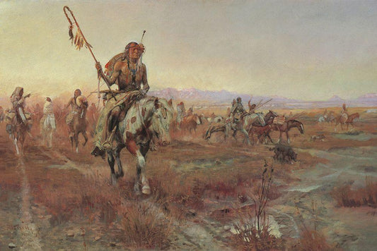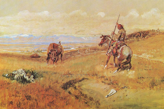 Indians Sighting Buffalo White Modern Wood Framed Art Print with Double Matting by Russell, Charles Marion