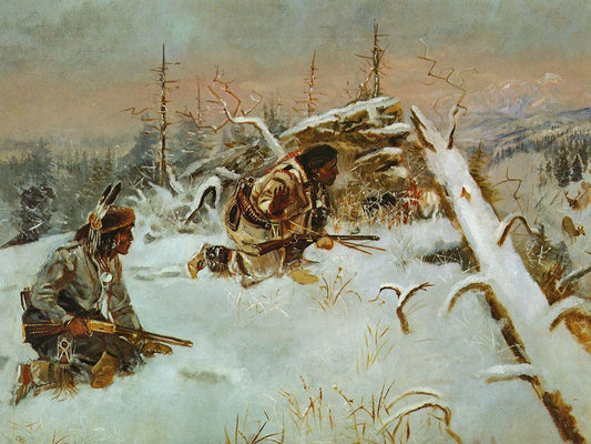 Crow Indians Hunting Elk White Modern Wood Framed Art Print with Double Matting by Russell, Charles Marion