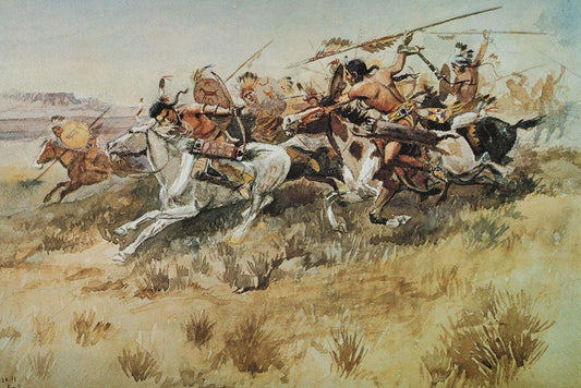 Indians Attacking White Modern Wood Framed Art Print with Double Matting by Russell, Charles Marion