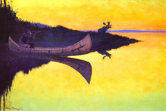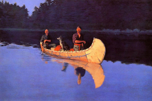 Evening On A Canadian Lake-Two men and a dog in a canoe White Modern Wood Framed Art Print with Double Matting by Remington, Frederic