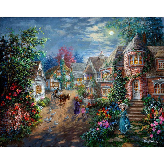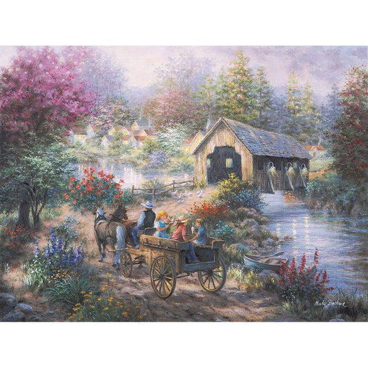 Merriment At Covered Bridge Black Modern Wood Framed Art Print with Double Matting by Boehme, Nicky