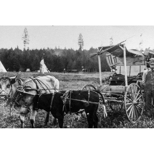 Oxen and Wagon-Old Oregon Trail White Modern Wood Framed Art Print by Vintage Photography