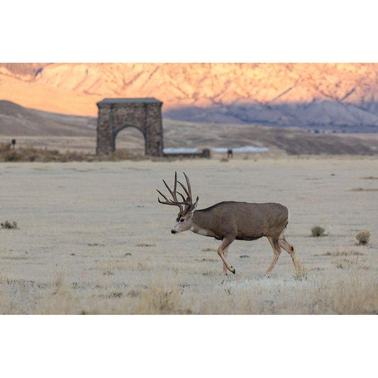 Mule Deer Buck and Roosevelt Arch, Yellowstone National Park White Modern Wood Framed Art Print by The Yellowstone Collection