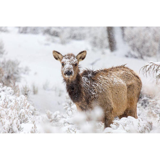 Female Elk in Snow, Mammoth Hot Springs, Yellowstone National Park White Modern Wood Framed Art Print by The Yellowstone Collection