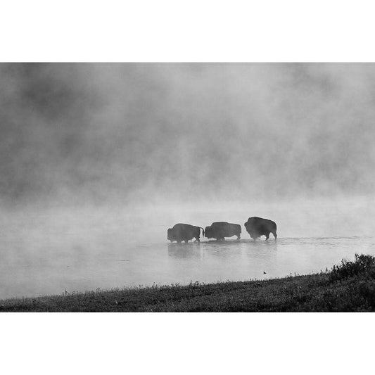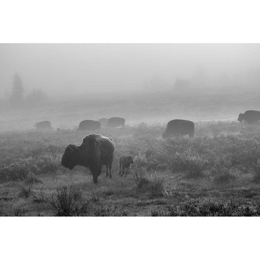 Bison in the fog, Swan Lake Flat, Yellowstone National Park White Modern Wood Framed Art Print by The Yellowstone Collection
