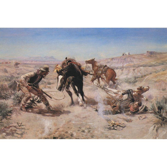 Roping a Wolf by the neck White Modern Wood Framed Art Print by Russell, Charles Marion