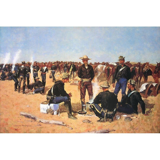 A Cavalrymans Breakfast on the Plains White Modern Wood Framed Art Print by Remington, Frederic