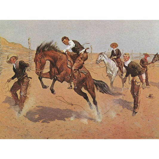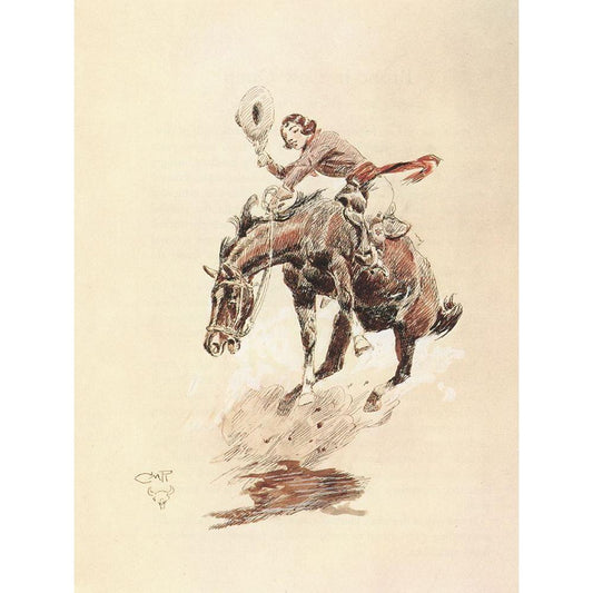 Bucking Horse and Cowgirl White Modern Wood Framed Art Print by Russell, Charles Marion