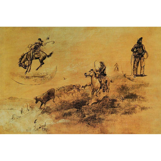 Bronco Busting-Driving in. Cow Puncher White Modern Wood Framed Art Print by Russell, Charles Marion