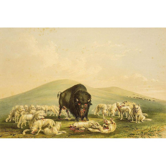 Buffalo Hunt, White Wolves Attacking Buffalo Bull White Modern Wood Framed Art Print by Catlin, George
