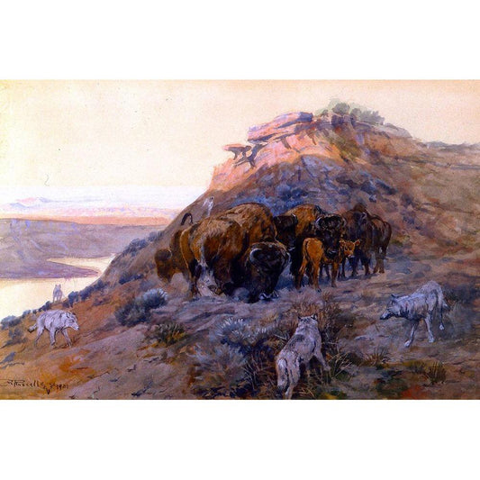 Buffalo Herd at Bay White Modern Wood Framed Art Print by Russell, Charles Marion