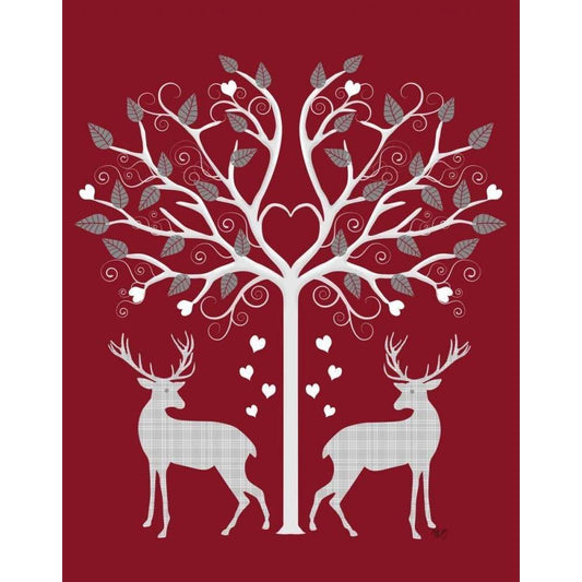 Christmas Des - Deer and Heart Tree, Grey on Red Black Modern Wood Framed Art Print with Double Matting by Fab Funky