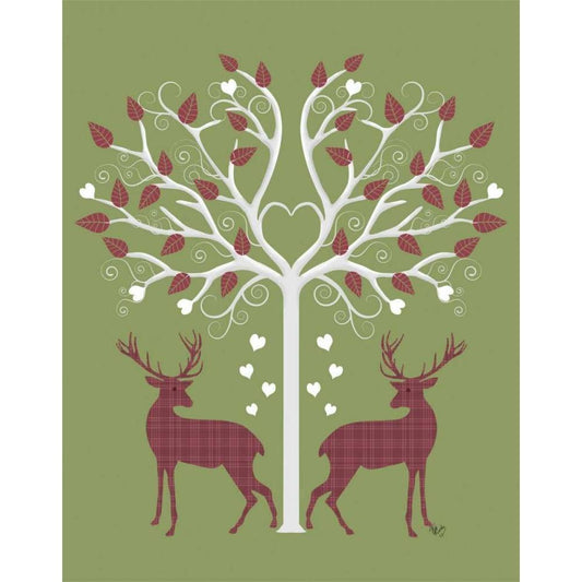 Christmas Des - Deer and Heart Tree, Pink On Green Black Modern Wood Framed Art Print with Double Matting by Fab Funky