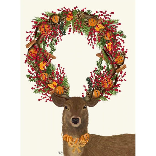 Deer, Cranberry and Orange Wreath, Full Black Modern Wood Framed Art Print with Double Matting by Fab Funky