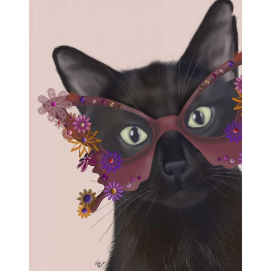 Cat and Flower Glasses Black Modern Wood Framed Art Print with Double Matting by Fab Funky