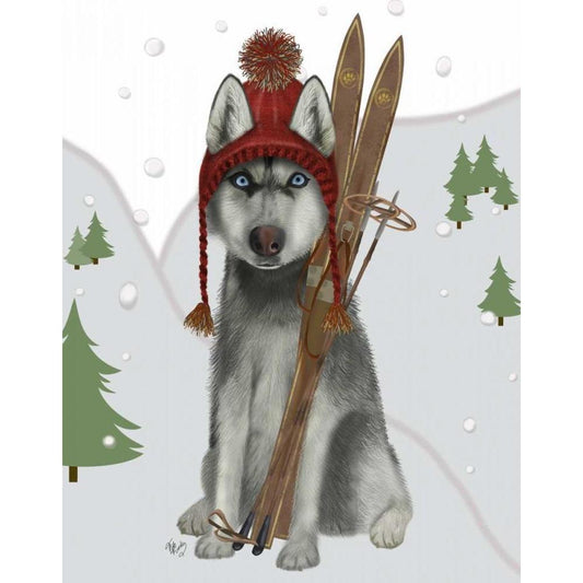 Husky Skiing Black Modern Wood Framed Art Print with Double Matting by Fab Funky