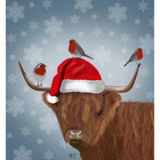 Highland Cow and Robins Black Modern Wood Framed Art Print with Double Matting by Fab Funky