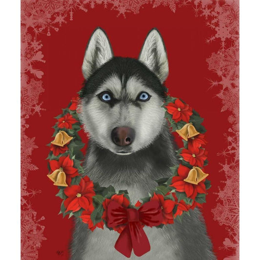 Husky and Poinsettia Wreath Black Modern Wood Framed Art Print with Double Matting by Fab Funky