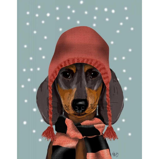 Dachshund With Woolly Hat and Scarf Black Modern Wood Framed Art Print with Double Matting by Fab Funky