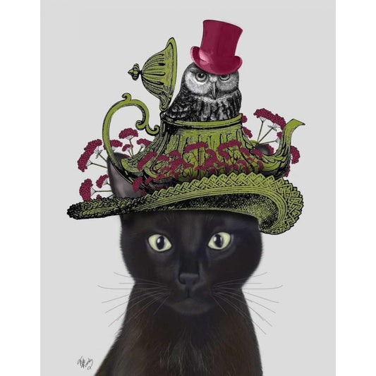Cat, Black with Fabulous Hat Black Modern Wood Framed Art Print with Double Matting by Fab Funky
