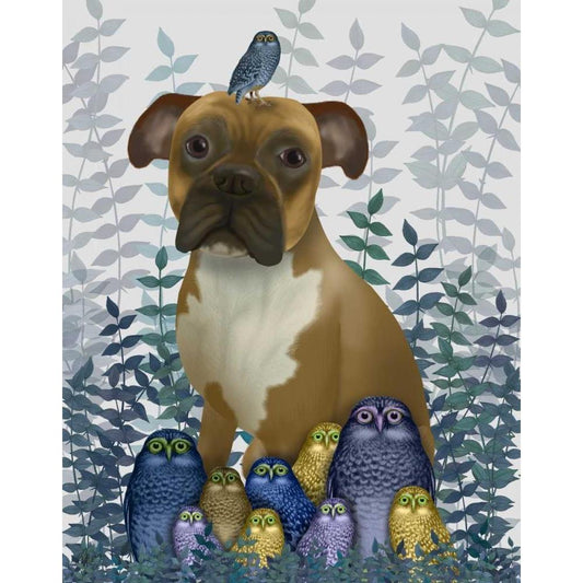 Boxer and Owls Black Modern Wood Framed Art Print with Double Matting by Fab Funky