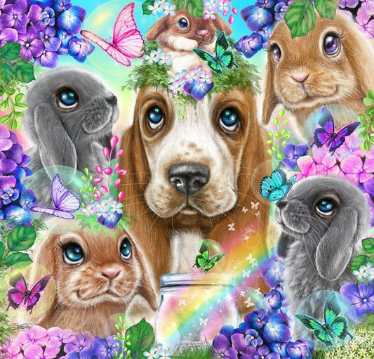 Basset Hound Bunnies n Butterflies Black Ornate Wood Framed Art Print with Double Matting by Sheena Pike Art