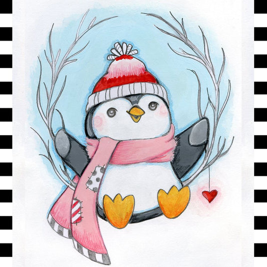 Penguin Wreath Black Ornate Wood Framed Art Print with Double Matting by Wade, Valarie