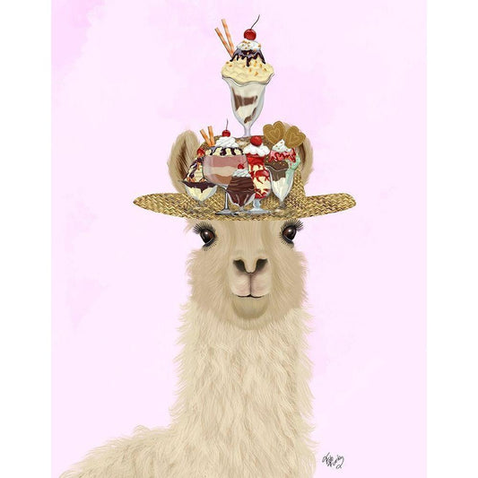 Llama Ice Cream Hat Black Modern Wood Framed Art Print with Double Matting by Fab Funky