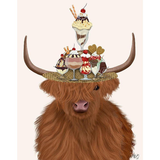 Highland Cow and Ice Cream Hat Black Modern Wood Framed Art Print with Double Matting by Fab Funky