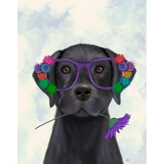 Black Labrador and Flower Glasses Black Modern Wood Framed Art Print with Double Matting by Fab Funky