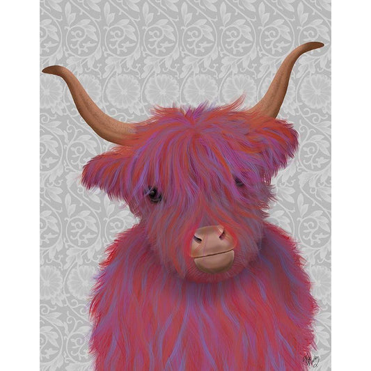 Highland Cow 7, Pink And Purple, Portrait Black Modern Wood Framed Art Print with Double Matting by Fab Funky