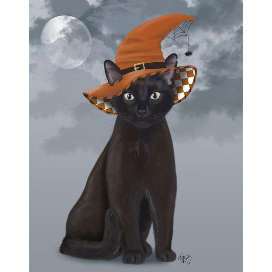 Halloween Black Cat in Witches Hat Black Modern Wood Framed Art Print with Double Matting by Fab Funky