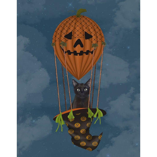 Halloween Black Cat in Pumpkin Hot Air Balloon Black Modern Wood Framed Art Print with Double Matting by Fab Funky