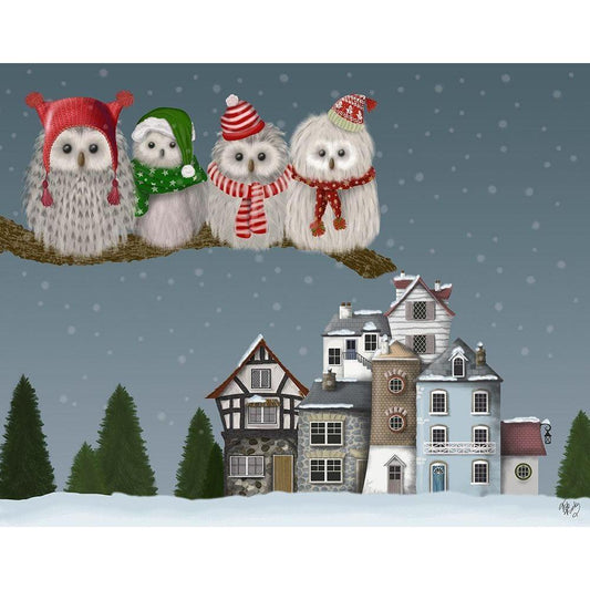 Christmas Christmas Owl Village Black Modern Wood Framed Art Print with Double Matting by Fab Funky