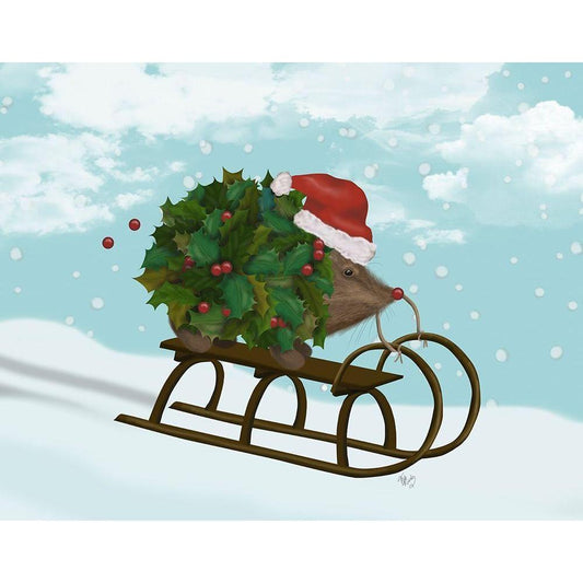 Christmas Holly Hedgehog Sledding Black Modern Wood Framed Art Print with Double Matting by Fab Funky