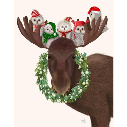 Christmas Moose and Christmas Owls Forward Black Modern Wood Framed Art Print with Double Matting by Fab Funky