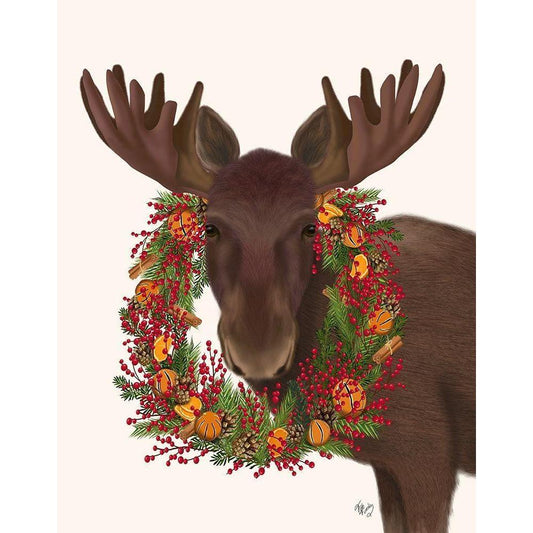 Christmas Moose and Cranberry Wreath Black Modern Wood Framed Art Print with Double Matting by Fab Funky