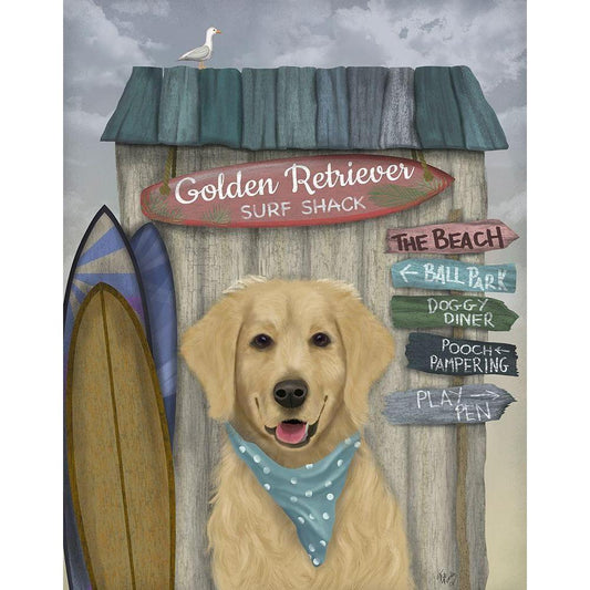 Golden Retriever Surf Shack Black Modern Wood Framed Art Print with Double Matting by Fab Funky