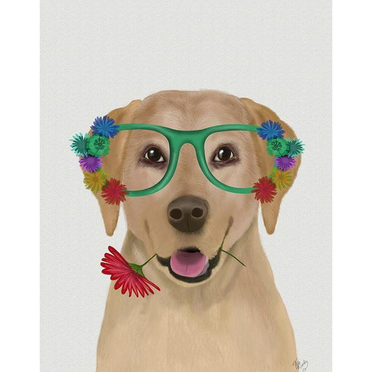 Yellow Labrador and Flower Glasses Black Modern Wood Framed Art Print with Double Matting by Fab Funky