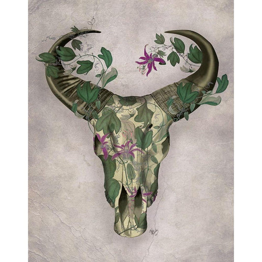 Cow Skull and Passion Flowers Black Modern Wood Framed Art Print with Double Matting by Fab Funky