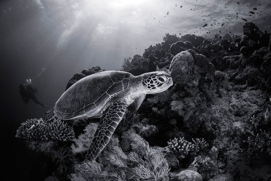Green Turtle In Black And White White Modern Wood Framed Art Print with Double Matting by Gabriel, Barathieu