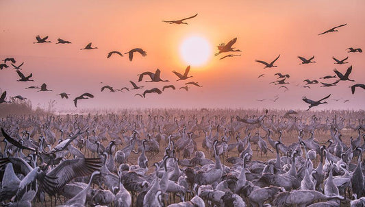 Cranes At Sunrise White Modern Wood Framed Art Print with Double Matting by Or, Keren