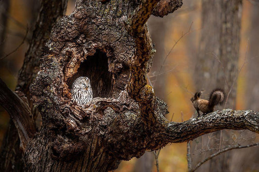 An Owl A A Squirrel White Modern Wood Framed Art Print with Double Matting by Tsui, Hung