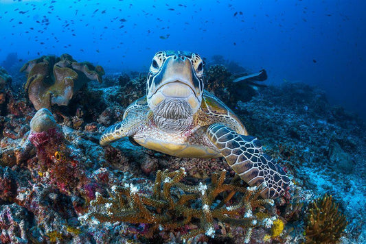Face To Face With A Green Turtle White Modern Wood Framed Art Print with Double Matting by Gabriel, Barathieu