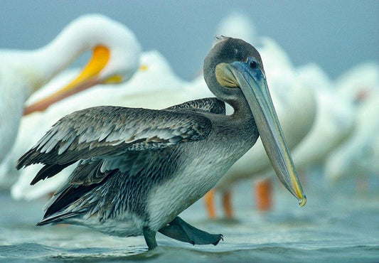 Brown Pelican with White Pelicans White Modern Wood Framed Art Print with Double Matting by Fitzharris, Tim