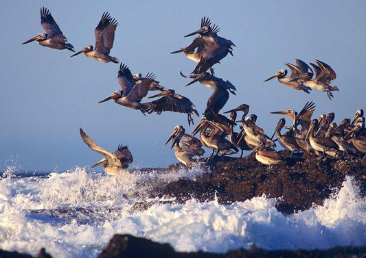 Brown Pelicans on Rock White Modern Wood Framed Art Print with Double Matting by Fitzharris, Tim